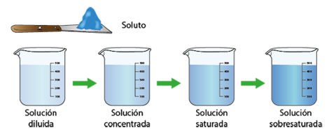 | Las tipos de soluciones son: -Diluida: Contiene la mínima cantidad de soluto. -Concentrada: Contiene una gran cantidad de soluto. -Saturada: Contiene la máxima cantidad de soluto que pueda disolver el solvente -Sobresaturada: contiene mas cantidad se soluto del que se puede disolver | |