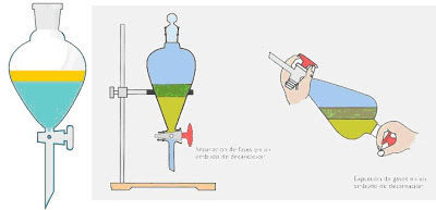 | -Decantación: Cuando se trata de un sólido y un líquido, el sólido, por ser el más denso, se depositará en el fondo del recipiente, mientras que el líquido quedará en la superficie, facilitándose así la separación de ambos componentes, la cual se logra inclinando el recipiente y vertiendo el líquido. Cuando se trata de dos líquidos que no son miscibles entre sí se emplea un instrumento llamado embudo de decantación, el cual permite el flujo de los líquidos. Al abrir una llave el líquido más denso pasa, quedando el menos denso en el embudo. | |