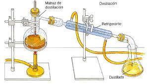 | -Destilación: Se utiliza cuando una de las dos sustancias de una mezcla es volátil. Existen dos tipos de destilación: Destilación simple: Es aquella en donde los vapores producidos son inmediatamente canalizados hacia un condensador, el cual los enfría de modo que el destilado no resulta puro. Destilación fraccionada: Se emplea cuando es necesario separar dos o más sustancias volátiles. Se utiliza una columna de fraccionamiento, la cual proporciona una gran superficie para el intercambio de calor. Los vapores de las diferentes sustancias volátiles ascienden y el aire que rodea a las columnas determina el enfriamiento y condensación en las diferentes zonas de la columna. | |
