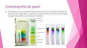 | -Cromatografía: Es aquella técnica que permite separar mezclas cuyos componentes difieren en el grado de absorción a la superficie de un material inerte (con el que no reaccionan). Si el material absorbente es papel, la técnica sé denomina Cromatografía de papel. En caso de que el solvente ascienda de manera más lenta son los que se absorben fuertemente. |