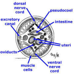 | this is a cross section of a ascaris or round worm. Just inside the outer body wall are the longitudinal muscles. the straight flat tube running the length of the body is the intestine. in the center is the short muscular pharynx. pseudocoelom that was mentioned before acts as a hydrostatic skeleton. the thin coiled strucutre is the female reproductive system, which is y shaped when uncoiled. one vagina can be found extending from the gential pour, a third of the way down the body from the anterior end. the vagina branches into to uteri and they into a thinner oviduct each, and then each oviduct into an ovary. | |