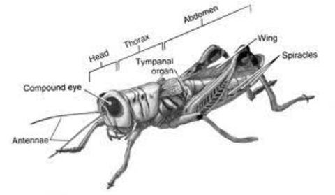 | this is a Romalea or grasshopper it has three tagmata or body regions, the head, thorax, and abdomen. each body segment is covered by plates called sclerities. The abdomen has ten sections with soft rings of cuticle in the underside of the abdomen, or the pleura. These are called spiracles, the opening of the tracheal system, which allows is responsible for gas exchange. The tergum and sternum are hardened while the lateral pleura is soft so allow for movement. they have large compound eyes consisting of hexagon facets. they also have three ocellis or simple eyes, one on the front, and one each near each compound eye. they have antennae that use for touch and smell as well as three pairs of mouth parts. they have three pairs of walking legs on the thorax that are uniramous or unbranched. the tips have fleshy pads for gripping surfaces. they adaption of these walking legs for many different uses is part of the great success of this phylum. they have two pairs of wings attached to the thorax, fore wings backwards over and abdomen, and hind wings underneath them, the hind wings being used the most in flying. | |