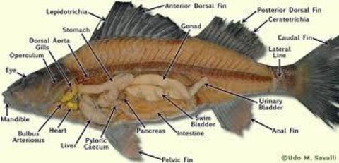 | this is a perca or a perch from the phylum Chordata. the body consists of the head, trunk, and tail, the head extending from snout to operculum, the hard bony plat covering the gills. the trunk is from head to anus and the tail is the rest called the caudal fin. the upper and lower jaws of the head enclose a large mouth which has small openings above it in the snout called nares, openings to the olfactory bulbs. the gills consists of gill filaments that are attached to a gill arch, the space between gill arches are called gill slits. the lateral line of pores that etend the length of the body contain sensory reseptors that allow the fish to sense movement from changes in water currents. the trunck and tail are covered in scales which increase in size as the fish grows but not in number. the epidermis and tehn a layer of mucus cover the body. they have two dorsal fins on top of the body, an anal fin underneath, a caudal fin at the end of the tail, two pectoral fins underneath near the head, a pair of pelvic fins just behind the pectoral fins. | |