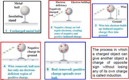 | Charging by Induction (steps) | 1. Uncharged metal ball 2. Neg. charge on rod repels electrons, creating zones of negative and positive induced charge. 3. Wire lets electron build-up (induced neg. charge) flow into ground. 4. Wire removed: ball now has an electron deficient region of positive charge. 5. Rod removed; pos. charge spreads over ball |