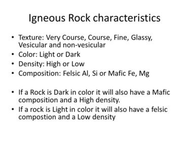 What does the texture tell us about igneous rocks? | Texture describes whether the rock is smooth or has obvious grains, lumps, air bubbles or interlocking crystals in it. |