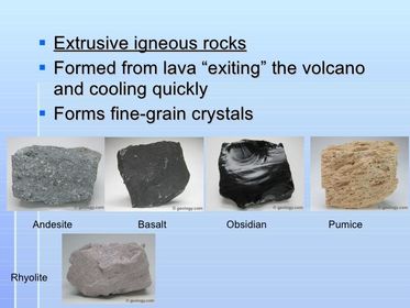 Why do extrusive igneous rocks have very small crystals in them? | Extrusive igneous rocks have very small crystals in them. The rapid cooling of these rocks makes the minerals solidify very fast, so large crystals don't have a chance to grow. |