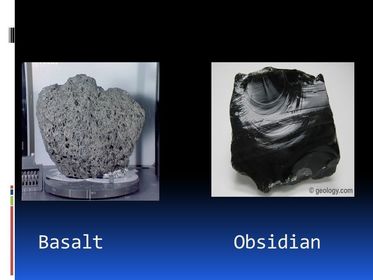 What's is the difference and similarities between Basalt and Obsidian? | Basalt is an example of an extrusive rock with small ,visible crystals, while obsidian is an example of an extrusive rock with no crystals. |