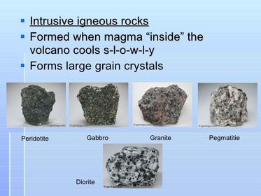 Why do intrusive igneous rocks contain large crystals? | Intrusive igneous rocks contain large crystals, which can usually be seen without a microscope. These crystals are the result of slowly cooling magma. The crystals also interlock with each other. |