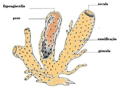 | Corpos dos Poríferos | De forma simplificada , é um cilindro oco fechado na base e uma abertura no topo que é chamada de Ósculo, seu corpo apresenta diversos furinhos, chamados poros por onde entra água e substratos.A parte interna é chamada de Espongiocela Ciclo da água em um porífero: Porócito -> Espongiocela -> Ósculo |