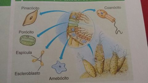 | Organização Celular dos Poríferos | Pinacócitos são celulas achatadas que revestem o corpo. Coanócitos são células que utilizam seu flagelo para determinar o fluxo d'água e obtenção de nutrientes. Porócito são celulas que apresentam um orifício central por onde a água passa. Escleroblastos são responsáveis pela sustentação Amebócito, são celulas ameboides capazes de originar todos os tipos de celulas poríferas |
