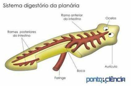 | Filo dos Platelmintos | Seres de corpos achatados. Representante : Planária, que vive em água doce , apresenta grande capacidade regenerativa e cavidade gastrovascular ramificada. As planárias secretam enzimas digestivas sobre o alimento para conseguir comê-lo os restos não digeridos são eliminados pela boca,ou seja, apresentam digestão externa. |