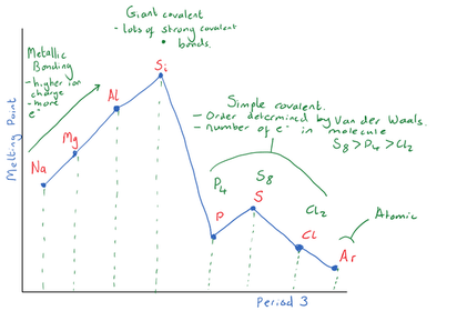 | Explain the trend in boiling points for P4(s), S8(s) and Cl2 (g) | SIMPLE MOLECULAR *weak van Der Waals ofrces of attraction between the molecules *little energy is needed to overcome them *boiling point for S8 >P4> Cl2 as it has more electrons and so greater van Der Waals between the molecules. |