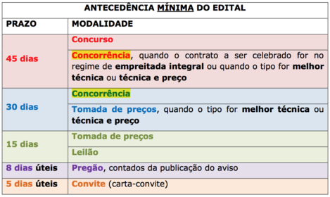 O edital deverá prever prazo entre a data de sua publicação e a apresentação das propostas pelos licitantes. Qual a antecedência mínima do Edital para cada modalidade? | |
