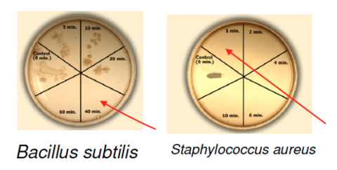 | LAB 14 Know the "Kelsey-Sykes Test". | – Alternative assessment approved by the European Union – Bacterial suspensions added to the chemical being tested – Samples removed at predetermined times and incubated – Lack of bacterial reproduction reveals minimum time required for the disinfectant to be effective |