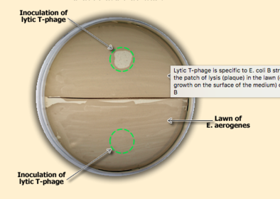 | LAB 19 How can you interpret your results form bacteria phage typing? | If there is an indentation (patches of lysis), then the bacteria was infected by the lytic T4-phage. |