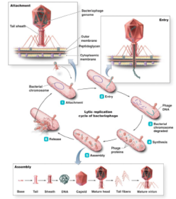 | LAB 19 Understand the lytic cycle. | 1. Attachment - Tail fiber to receptor 2. Entry - Lysozyme weakens the cell wall 3. Degradation of host cells genetic material - by viral enzymes 4. Synthesis of new viruses 5. Assembly of new viruses 6. Release - Lysozyme weakens the cell wall |