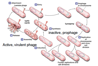 | LAB 19 Understand the lysogenic cycle. | 1. Attachment of Lambda phage 2. Entry 3. Prophage in host bacteria DNA (bacteriophage genetic material that is inactive until triggered) 4. Replication of chromosome and virus & cell division 5. Induction ----------> become virulent and enters lytic cycle |