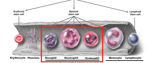 | LAB 20 Know which leukocytes are granular and what their differentiating trait it. | They contain large granule that can stain different colors. Basophil, neutrophil, and eosinophil. |