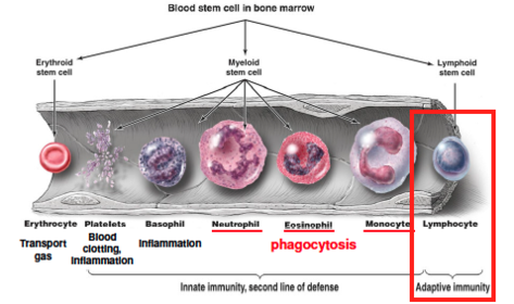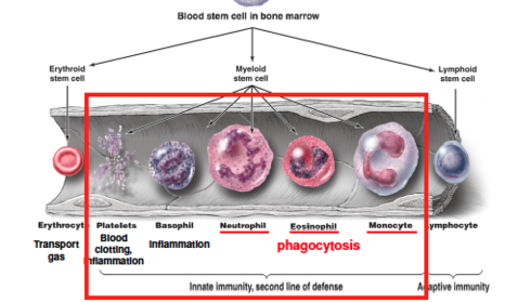 | LAB 20 Which leukocytes are associated with innate immunity & the second line of defense? | 1. Platelets-blood clotting & inflammation 2. Basophils-Inflammation 3. Neutrophils-Phagocytosis 4. Eosinophils-Phagocytosis 5. Monocytes-Phagocytosis |
