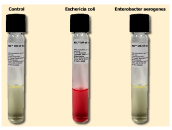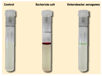 | LAB 17 How do you interpret the results of the Indole test? | Kovac's reagent is being used to test for the presence of Indole as a result of the breaking down of tryptophan. E. Coli : Red = Indole is present E. Aerogenes : Yellow = Indole is absent |