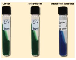 | LAB 17 How do you interpret the results of the Citrate test? | Bromothymol blue is the reagent used to test for permeases and alkalinity. E. Coli : Green = No permeases present E. Aerogenes : Blue = Permeases present |