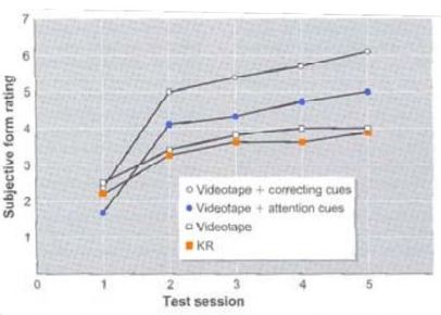 Draw a graph to show how good a video tape, video tape with correctional cues, video tape with attentional cues and knowledge of results are as forms of feedback. |