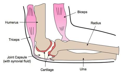 | Label a diagram of the human elbow joint, including cartilage, synovial fluid, joint capsule, named bones and antagonistic muscles (biceps and triceps) |