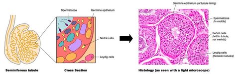 | Annotate a light micrograph of testis tissue to show the location and function of interstitial cells (Leydig cells), germline epithelium cells, developing spermatozoa and Sertoli cells | |