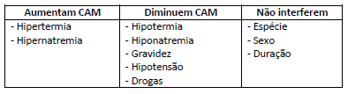 | Defina CAM e a sua importância | CAM (concentração alveolar mínima) é a concentração a 1 atm de anestésico inalatório necessária para abolir em 50% da população testada o reflexo de retirada mediante a um estímulo padrão (incisão cirúrgica da pele). Sua importância é que serve como medida da potência dos anestésicos inalatórios (quanto menor a CAM, maior é a potência do fármaco). |
