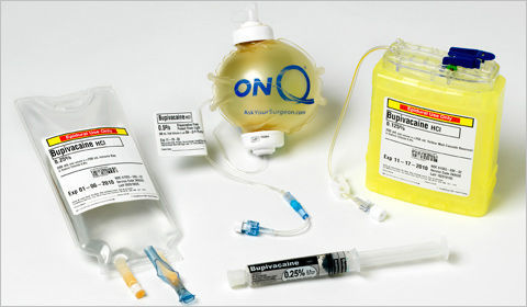 | Bupivicaine On-Q Pump Route & Dose | Via Catheter at wound site Dose rate variable : 1-7 mL/hr and 2-14 mL/hr A portable device ON-Q pump continuously infuses the local anesthetic through 2 small catheters inserted at wound site. *To be given only by or under the direct supervision of a doctor. |
