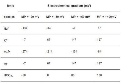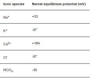 Using the data from the previous question calculate the electrochemical gradients for Na+, K+, Ca2+, Cl-, and HCO3- when Vm is -90mV, -30mV, +50mV, and +100mV. | The electrochemical gradient for a particular ion is given by the difference between the Vm and the E. By convention, inward I<0, so for all those values where electrochemical gradient<0, the inward mov of cations (influx) is favored. For I>0 outward mov of cations (efflux) is favored. An electrochemical gradient<0 would give rise to an efflux of anions and a value>0 would give rise to an influx of anions. |