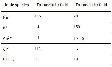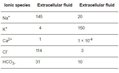 Use the Nernst equation to calculate E for the following distribution of ions in mammalian SKM (values in mmol/L) (RT/F=26.7mV at 37°C) | |