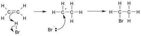 | Outline the mechanism which turns an alkene into a haloalkane |