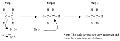 | Outline the mechanism which turns an alkene into a dihaloalkane |