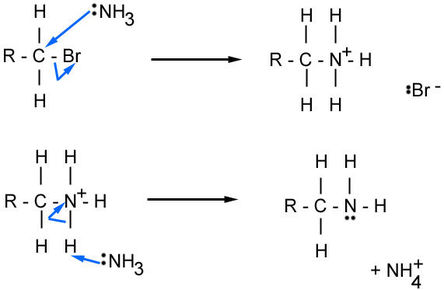 | Outline the mechanism that produces an amine from a haloalkane | |