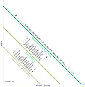 | Law of demand | 1. Negative causal relationship between price and quantity demanded: "As the price of a product falls, the quantity demanded of the product usually increases, ceteris paribus" 2. |