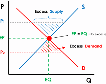 | Excess supply: Qd<Qs Excess demand: Qs<Qd |