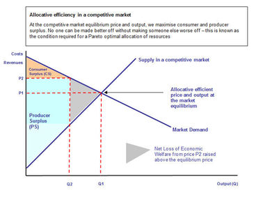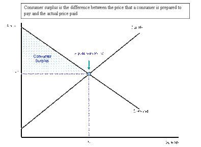 | Allocative efficiency from society's point of view | At equilibrium, where demand is equal to supply, consumer surplus is maximised. This is known as allocative efficiency. Given these conditions of demand and supply, there is no other combination of price and quantity that would give a greater community surplus. |