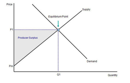 | Producer surplus | The excess of actual earnings a producer makes from a given quantity of output, over and above the amount the producer would be prepared to accept for that output. |