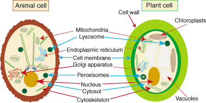 | What is the difference between an animal and a plant cell? | Animal cells do not have a cell wall or chloroplasts but plant cells do. Animal cells are round and irregular in shape while plant cells have fixed, rectangular shapes. |