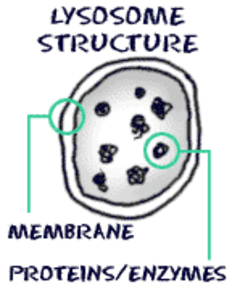 | LYSOSOME: Appearance: A round organelle surrounded by a membrane with no clear internal structure. Function: Contains digestive enzymes and are used during phagocytosis and they digest invading cells or break down worn components of the cell. | |