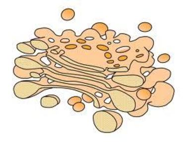 GOLGI APPARATUS; Appearance: A group of fluid filled flattened sacs. Function: Processes and packages new lips and proteins. It also makes lysosomes. |