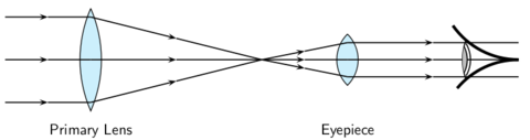 | How does a telescope with two converging lenses work? Draw a diagram | |