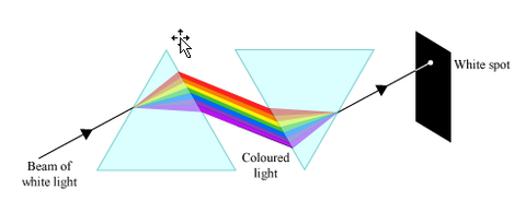 | What happens if you shine white light through 2 prisms? | The spectrum colours recombine to form white light again. |