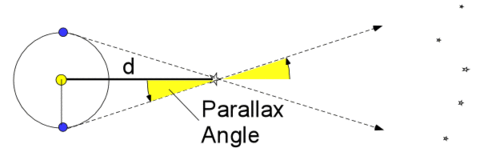 | Calculating distance (in parsecs) equation | Distance (parsecs) = _______1_______ parallax angle (sec) |