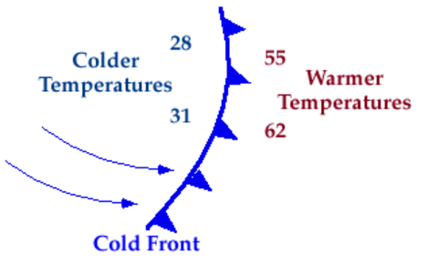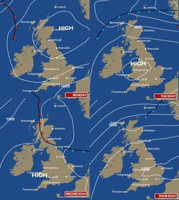 | Q: What weather does high pressure cause? | A: Clear skies (hot weather in summer) |