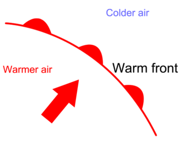 A: Stage 1. An area of warm air meets and area of cold air. Stage 2. The warm air is forced over the cold air Stage 3. Where the air meets the warm air is cooled and water vapour condenses. Stage 4. Clouds form and precipitation occurs |