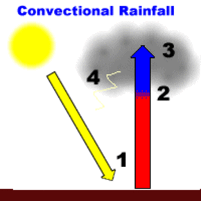 | Q: What is convectional rainfall? | A: When the ground gets heated by the sun, the air above it gets hot and rises. The warm, moist, rising air cools and condensation occurs. As water droplets become larger, they fall as heavy rain |