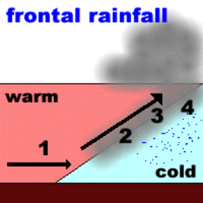 | Q: What is frontal rainfall? | A: When a warm air mass meets a cold air mass, the warm air is forced upwards - producing rain |