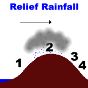 | Q: What is relief rainfall? | A: When the wind meets a line of high hills or mountains, the air rises and cools - producing rain. |